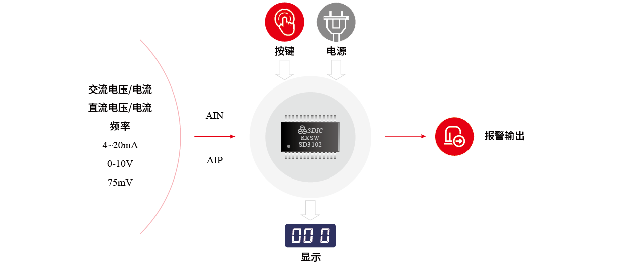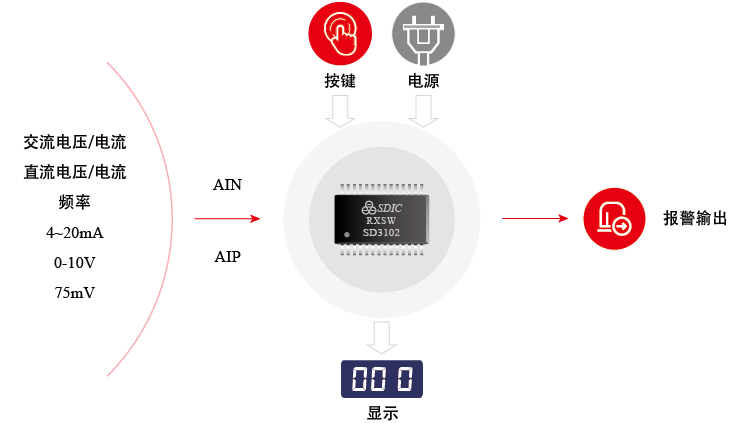 本系列产品针对数显表头应用设计,芯片集成了T-RMS计算器、显示驱动、DSP单元等功能电路,在交直流表头应用具备成熟方案,可实现交直流电压、交直流电流、频率等常见工业电信号的高精度测量,同时可扩展报警输出功能。内部集成先进的校准算法,满足测量精度的情况下,极大的节省客户的校表时间,且校准系数可保存至芯片内部,节省外部存储器。