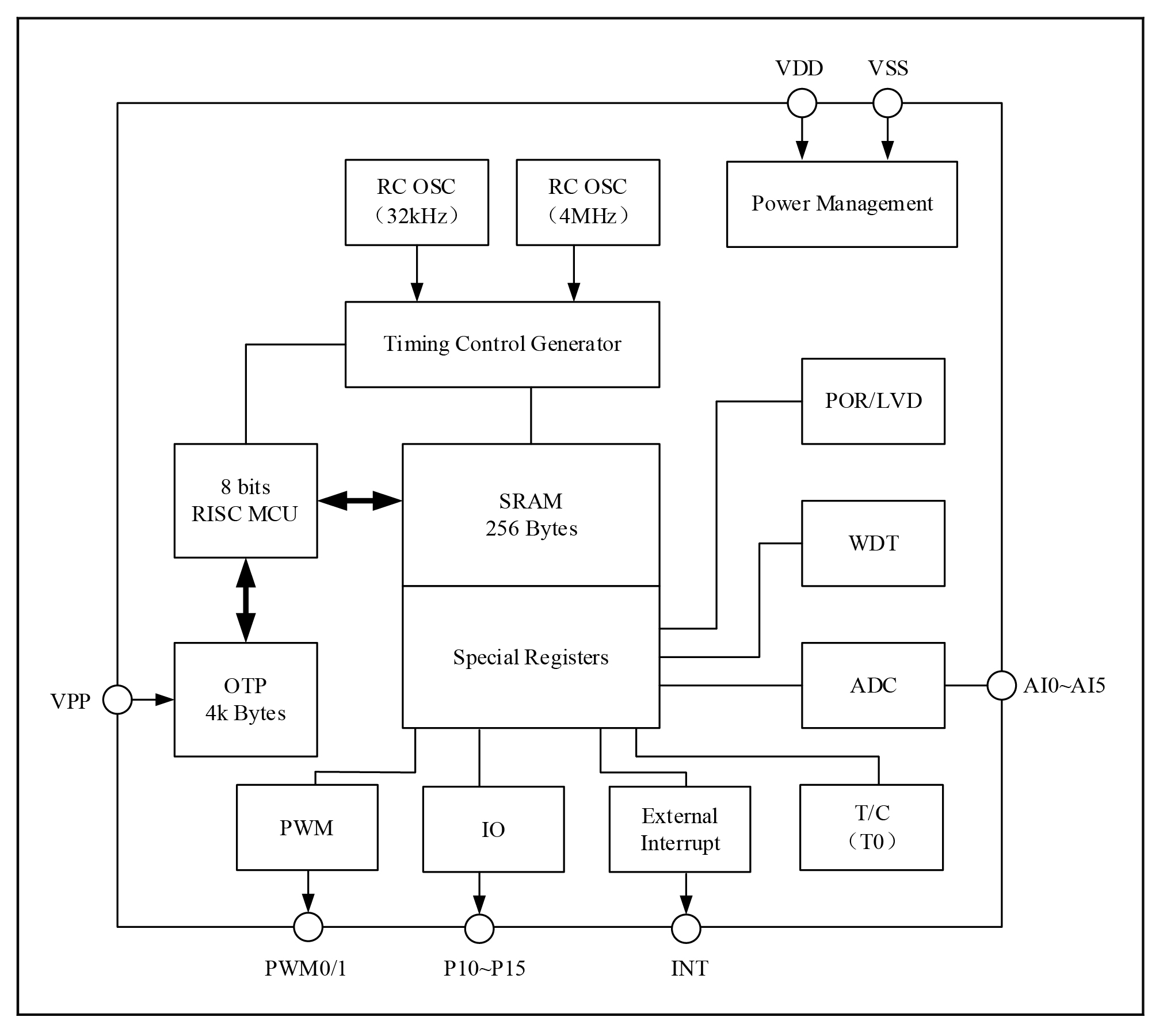 8-bit RISC low power MCU, 49 instructions and 6 stack levels. The typical MCU current consumption is: 300μA at 3V and 2MHz operating clock rate, 2μA at standby and 32kHz clock rate, and 1μA at sleep