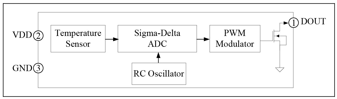 SD5003 is a highly accurate temperature measurement IC with digital PWM output. An internal sensor produces a voltage signal that is proportional to temperature. It is then digitized by a built-in ADC, and modulated into a PWM waveform. The typical error is ± 0.8℃ for the -40~+100℃ range, and ±1.0℃ for the -55~+125℃ range.