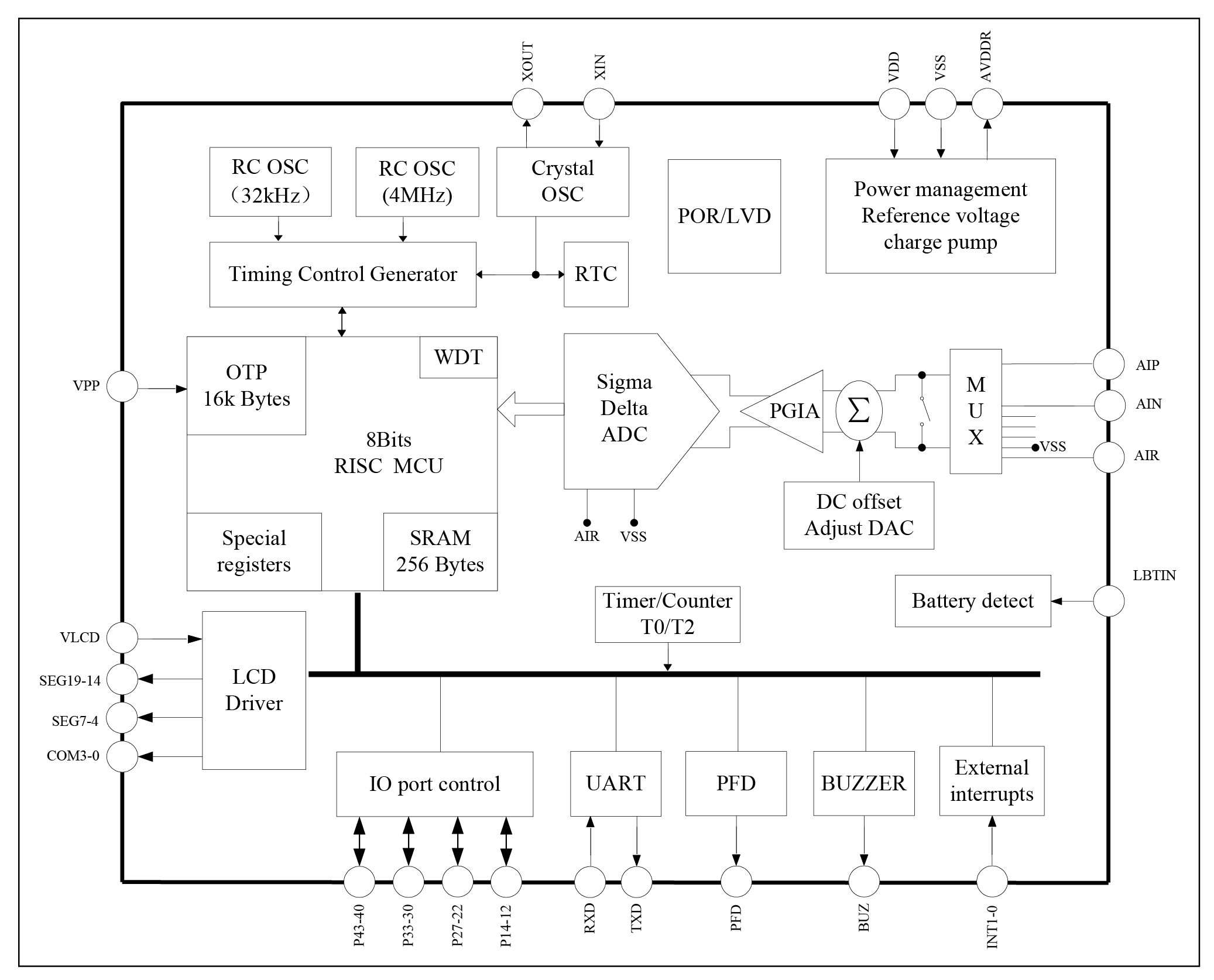 8 bits RISC ultra low power MCU, 49 instructions and 6 stack levels. The MCU current consumption is 600uA typically at 3V and 2MHz operating clock rate, 1.8uA at standby and 32kHz clock, and less than 1uA at sleep