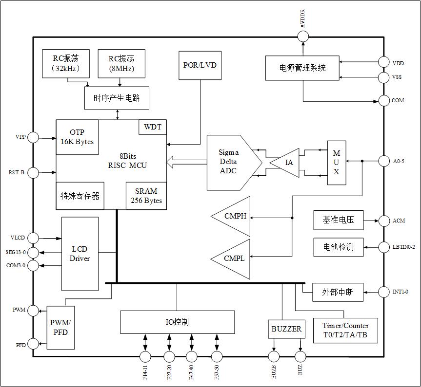 8位RISC超低功耗MCU,49条指令,6级堆栈,在2MHz工作时钟,MCU部分在3.3V工作电 压下电流典型值为400μA;32kHz时钟待机模式下工作电流1.5μA,休眠模式电流小于1μA