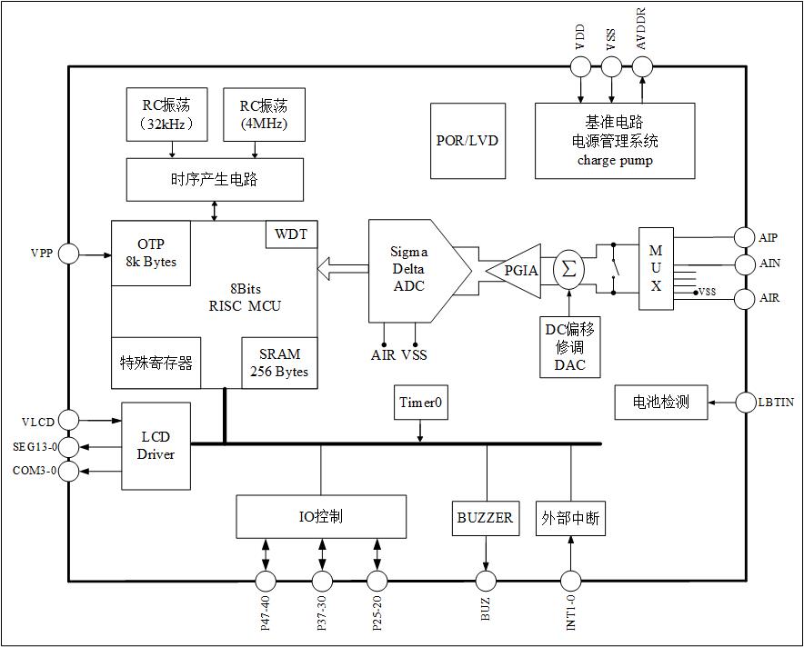 8位RISC超低功耗MCU,49条指令,6级堆栈,在2MHz工作时钟,MCU部分在3V 工作电压下电流典型值为800μA; 32kHz时钟待机模式下工作电流2μA,休眠模式 电流典型值为1μA