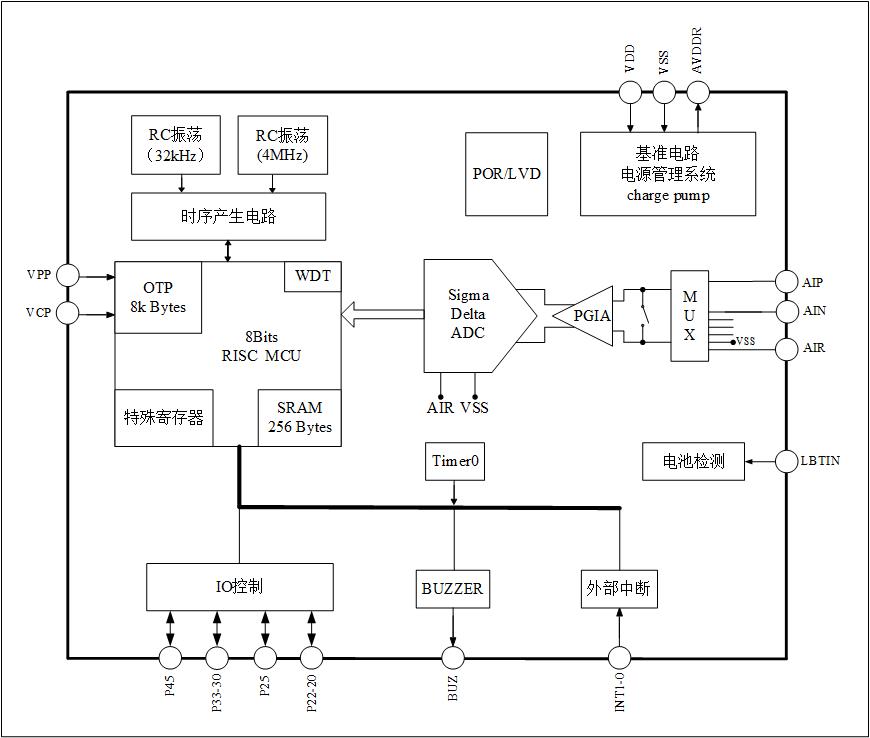 8位RISC超低功耗MCU,49条指令,6级堆栈,在2MHz工作时钟,MCU部分在3V 工作电压下电流典型值为500μA; 32kHz时钟待机模式下工作电流1.5μA,休眠模 式电流典型值为1μA