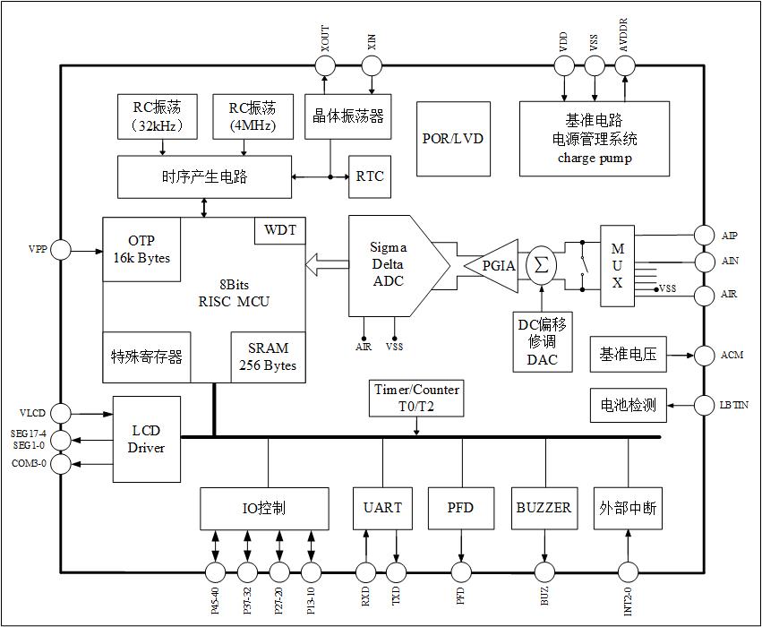 16SEG×4COM液晶驱动电路,超低功耗和大驱动能力设计;内含程控升压模块, 可以在低压条件下维持高亮显示