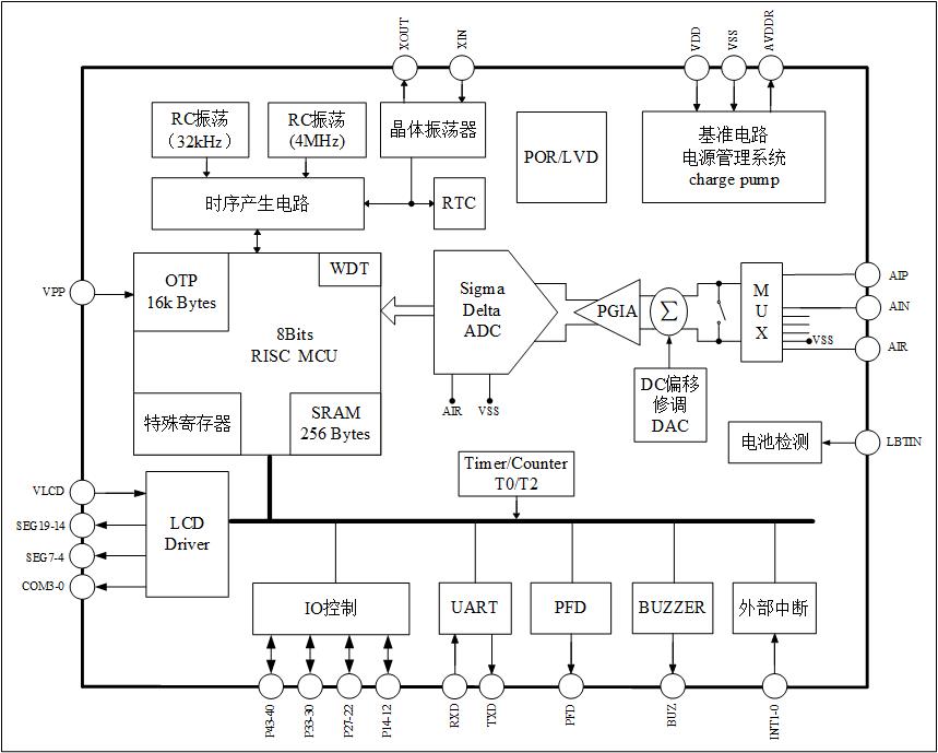 本芯片是带20位ADC的SoC产品,程序存储器为16k Bytes OTP,可以低压自烧录,烧录电压范围:2.4~3.6V,用于替代外部EEPROM。外围只需要5个电容,器件很少,非常适合人体秤等家用秤应用。