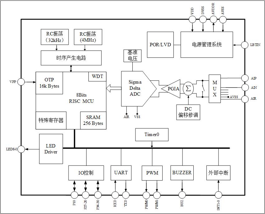 本芯片是带20位ADC的SoC产品,程序存储器为16k Bytes OTP。外围器件很少,非常适合带LED显示的人体秤和厨房秤等家用秤的应用。