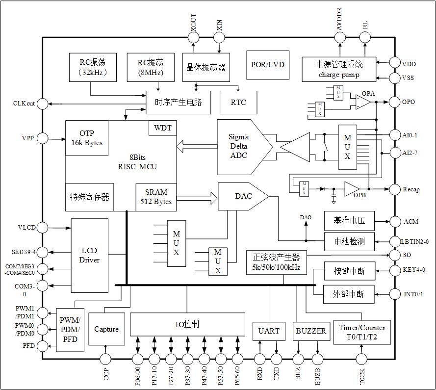 8位RISC超低功耗MCU,49条指令,6级堆栈,在2MHz工作时钟,MCU部分在3V 工作电压下电流典型值为400μA; 32kHz时钟待机模式下工作电流1.5μA,休眠模 式电流小于1μA