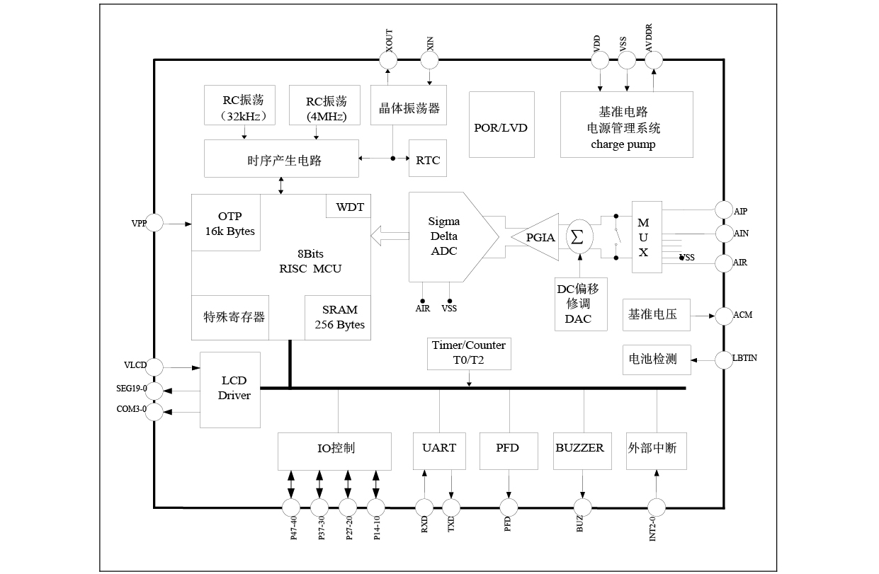 内置高频 4MHz 和低频 32kHz 的 RC 振荡,无需外部时钟