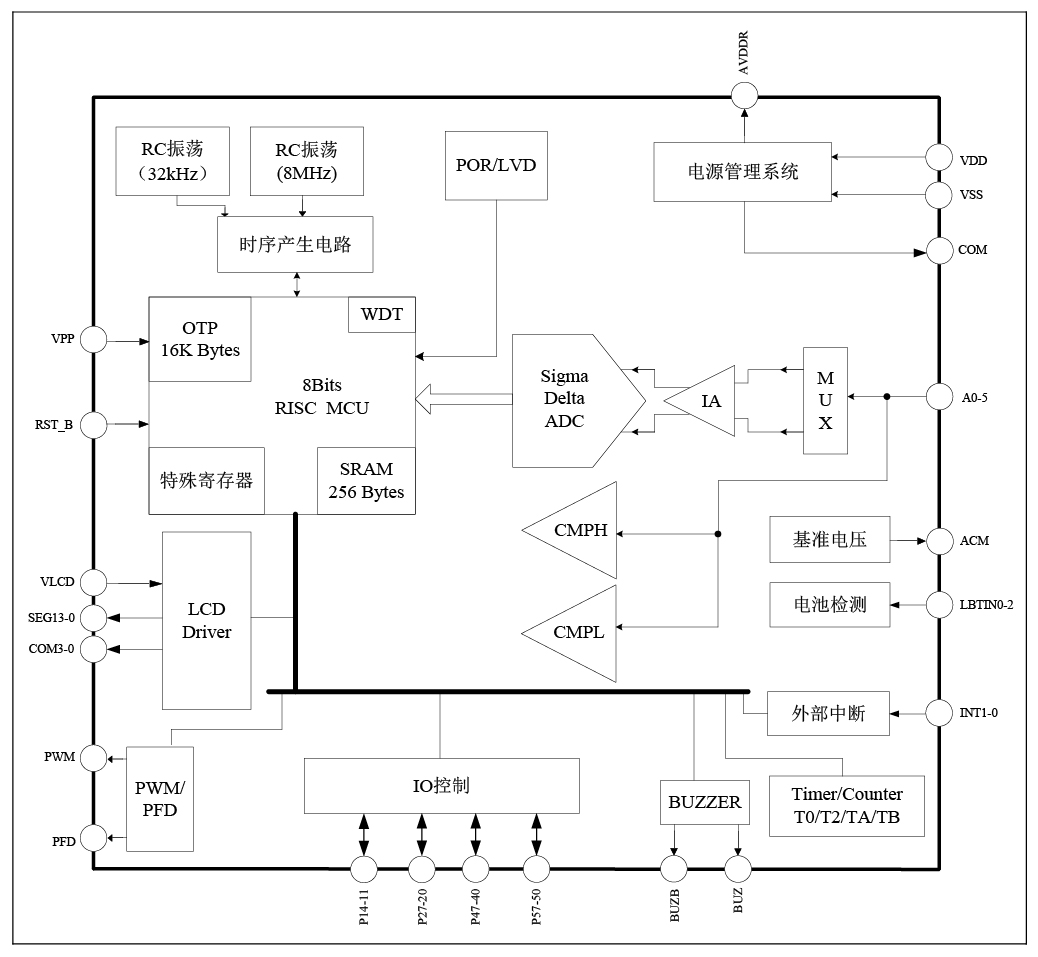 8 位 RISC 超低功耗 MCU, 49 条指令, 6 级堆栈,在 2MHz 工作时钟, MCU 部 分在 3.3V 工作电压下电流典型值为 400μA; 32kHz 时钟待机模式下工作电流 1.5μA, 休眠模式电流小于 1μA