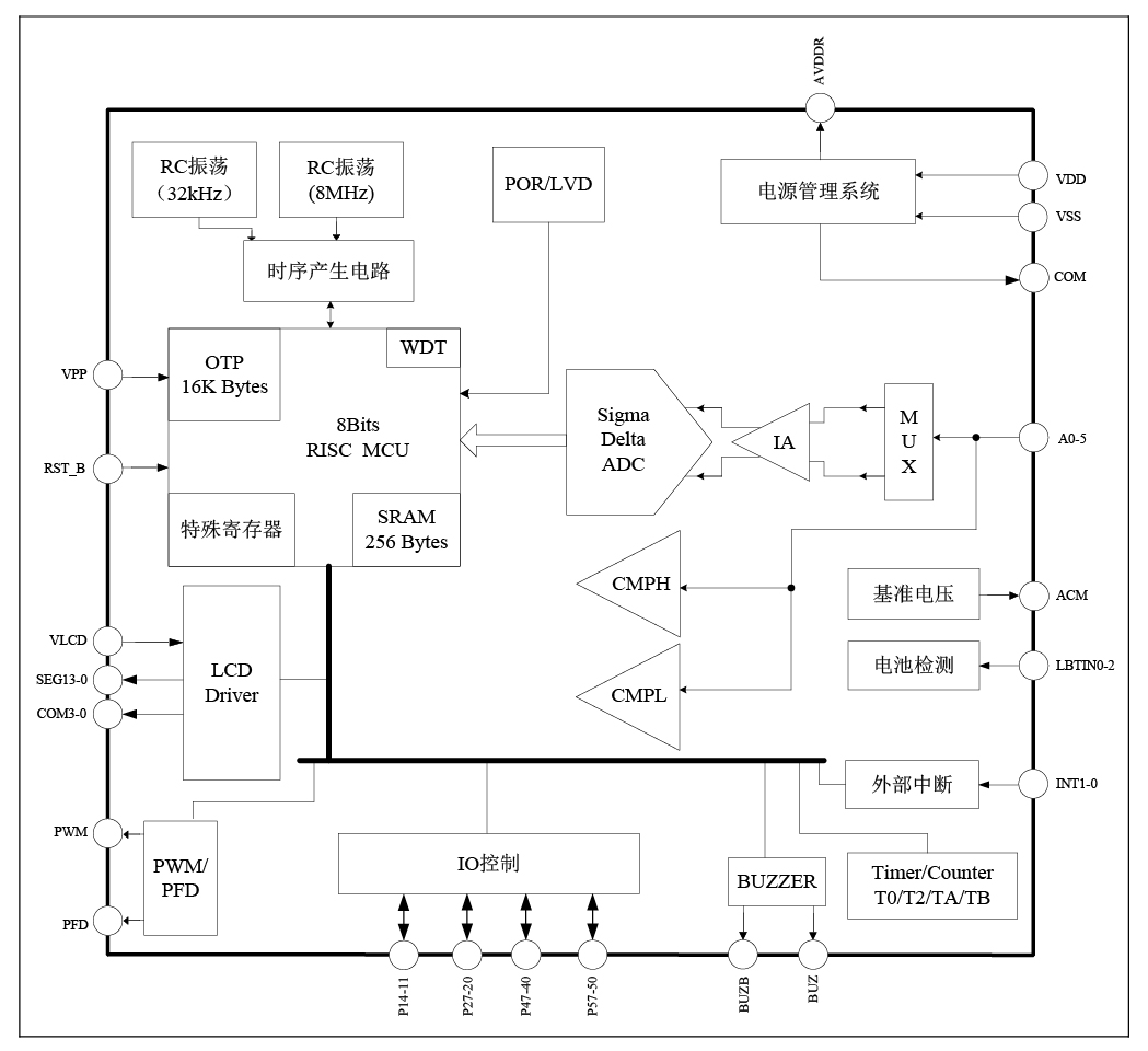 8 位 RISC 超低功耗 MCU, 49 条指令, 6 级堆栈,在 2MHz 工作时钟, MCU 部 分在 3.3V 工作电压下电流典型值为 400uA; 32kHz 时钟待机模式下工作电流 1.5uA, 休眠模式电流小于 1uA