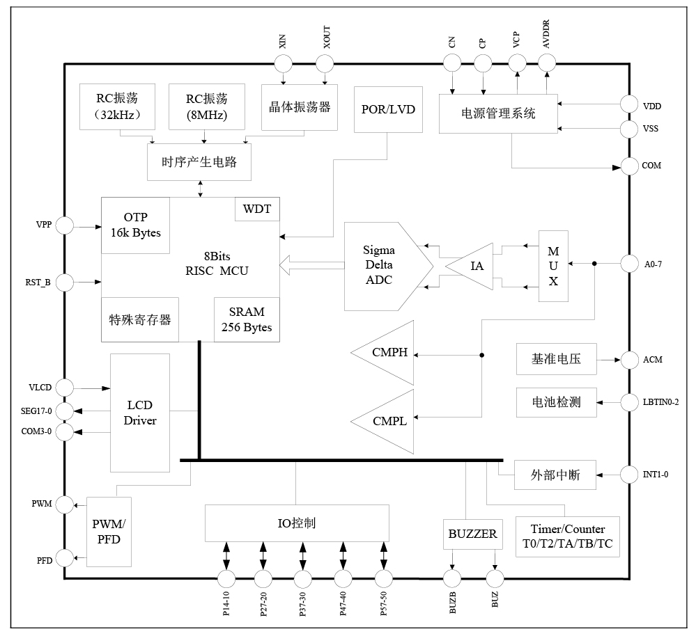 8 位 RISC 超低功耗 MCU, 49 条指令, 6 级堆栈,在 2MHz 工作时钟, MCU 部 分在 3.3V 工作电压下电流典型值为 400μA; 32kHz 时钟待机模式下工作电流 1.5μA, 休眠模式电流小于 1μA