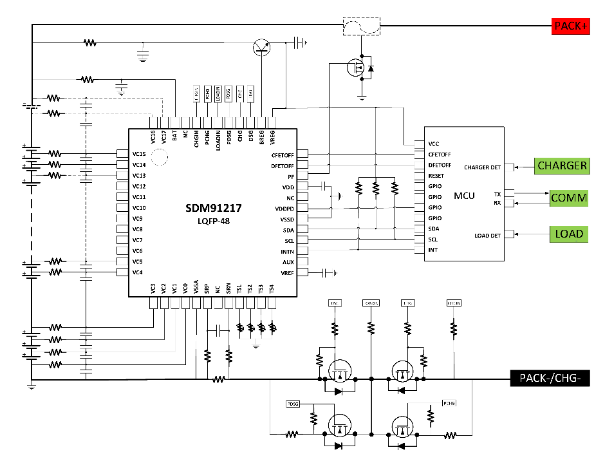 SDM91217是一颗支持 7~17 串锂、钠离子电池的高集成度、高性能、高精度监控和保护芯片。集成两路独立的高精度Σ -Δ ADC, 对电压,电流和温度进行精准测量。同时集成硬件电压,电流保护, PF 保护等功能,提升电池包的安全可靠性,以及提升 HOST 对SOC/SOH 的计算精度。可应用于电动两轮车、 通信储能、 家用储能、 便携储能、园林工具、割草机、无人机等。