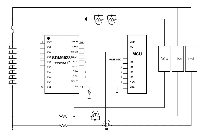SDM9028是一颗集成 OV/UV/OT/UT 保护功能,同时集成均衡功能的 5~8 串锂离子AFE 芯片。提供 1~8 串电池电压的电平转换电路,可将单节电池电压以相同的增益,转换为以地为基准的模拟电压信号,并以 0.5 倍分压输出。本产品的技术规格更加适用于 5~8 串的吸尘器,洗地机应用,所集成的二级硬件保护,有助于满足安规认证要求。也可应用于电动工具、园林工具、两轮车、高功率移动电源等。