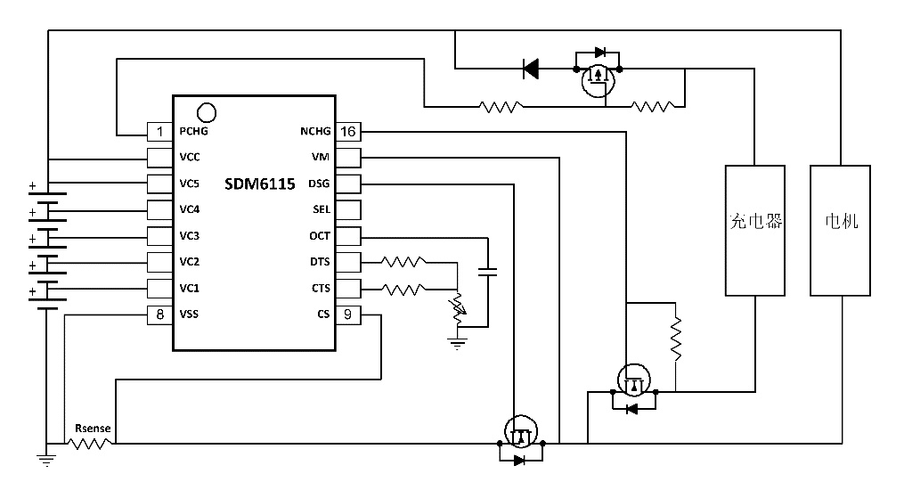 SDM6115是一颗支持 3~5 串锂电池应用,集成 OV/UV/LV/OW/OC/SC/OT/UT 等的高精度硬件全保护芯片。集成高精度的硬件电压保护、电流保护和温度保护功能,可独立完成过压 OV,欠压 UV,放电一级过流 DOC1,放电二级过流 DOC2,短路保护 SC,以及充电过温 COT,充电低温 CUT,放电过温 DOT,放电低温 DUT 等保护和解保护动作。通过 SEL PIN 的电平,用户可灵活配置 3/4/5 串的应用,极大的提升了用户的备货便利性。